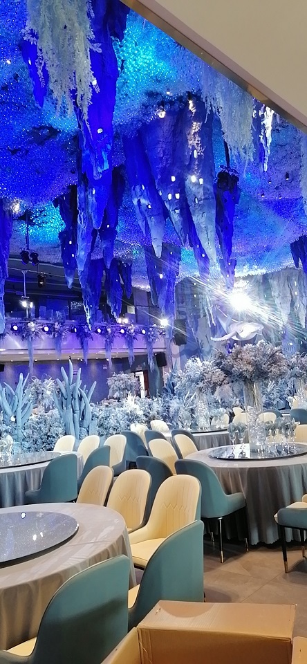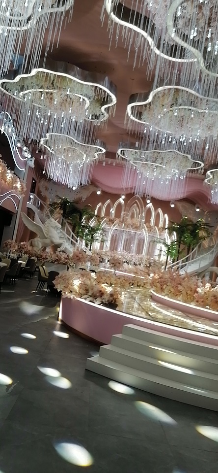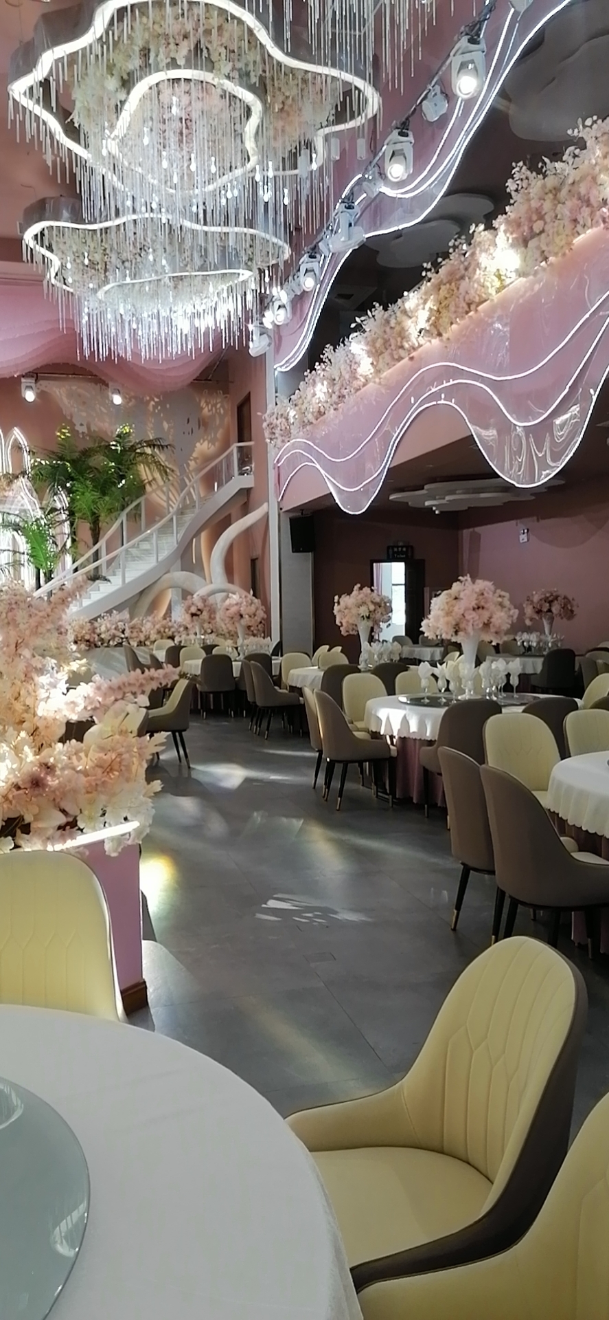 走进喜寿宫,呈现眼前时尚奢华的装潢,显得大堂极具富丽堂皇,宴会厅更是琳琅满目,天花板上华丽的水晶吊灯,每个角度都折射出如梦似幻斑斓彩光。华美的欧式桌椅、插满粉红色鲜花的白色花瓶,透明的玻璃围栏铺满了粉红色的鲜花,垂涎在粉红色的墙壁上,宴会厅处处散发着贵族气息。